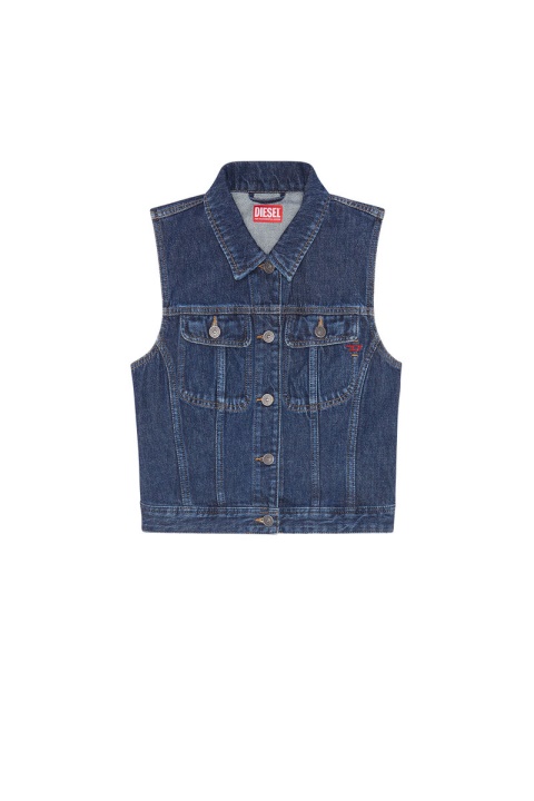 גופיית משאית לנשים עם גזרה דקה ומעט קצוצה. מפורט עם רקמת לוגו ד אדום בחזה. כביסה כחולה כהה זו עשויה מג’ינס קבוע ומועשרת בטיפולים עדינים.
