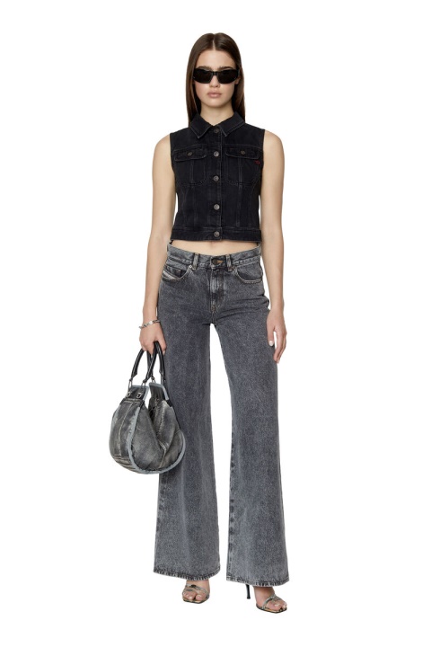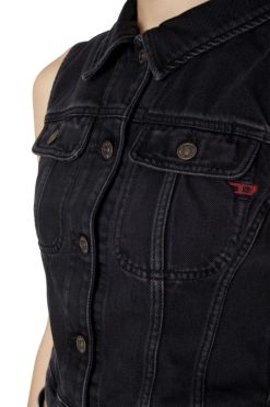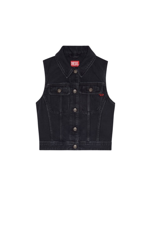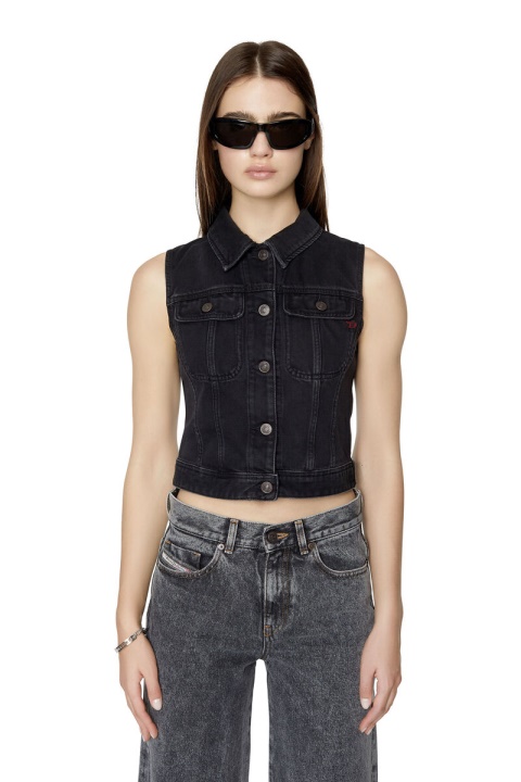 גופיית ג’ינס לנשים עם צללית קלאסית של משאית. לסגנון דק זה יש מכפלת קצוצה מעט ולוגו D אדום רקום בחזה. זוג ג’ינס מתקן זה מציג שטיפה שחורה ונקייה.