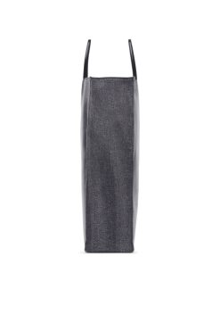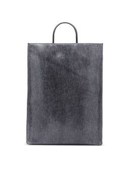 תיק גדול זה לשני המינים מעוצב על פי שקית הקניות החדשה של נייר בחנות. כולל לוגו מודפס בלייזר ופרטי עור, הוא עשוי מג’ינס באפקט שיש שחור מצופה בגימור שקוף.