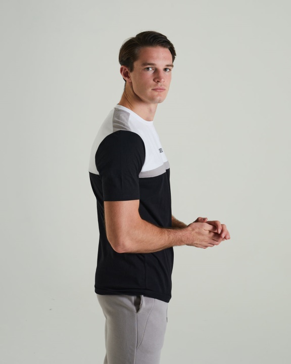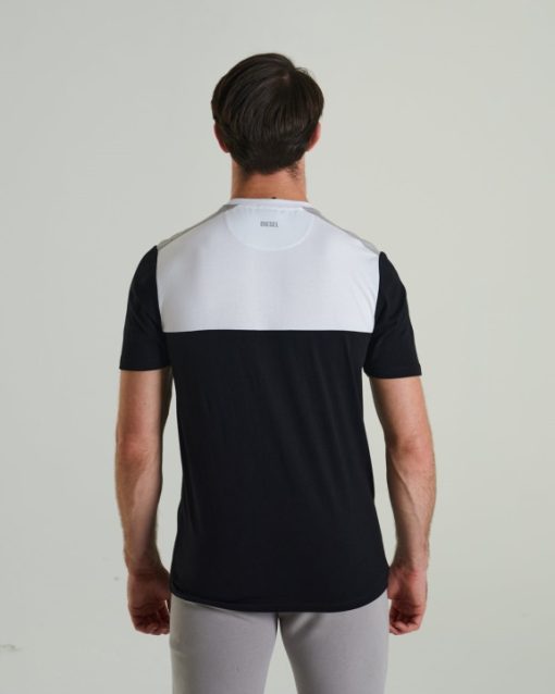 טי כותנה רכה לגברים בעיצוב קולור בלוק, הדפסה ג’ל בחזה ולוגו DIESEL רפלקטיבי בצוואר האחורי. הדוגמנית לובשת מ.