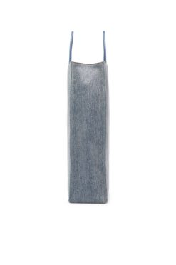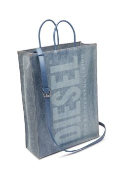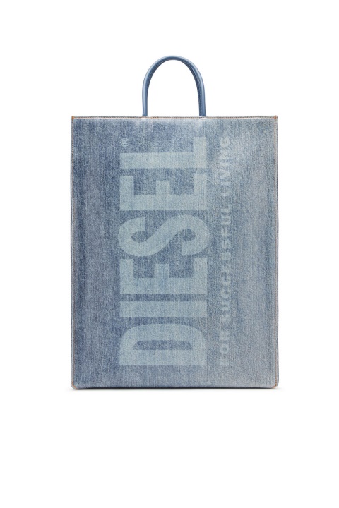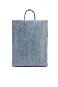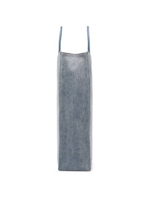 תיק לשני המינים הגדול הזה מעוצב על פי שקית הנייר החדשה המשמשת בחנויות של דיזל. כולל לוגו מודפס בלייזר ופרטי עור, הוא עשוי מג’ינס בעל אפקט שיש כחול מצופה בגימור שקוף.