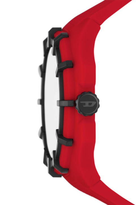 אחריות השעון עם מסגרת 51 מ”מ של דיזל כולל חוגה שחורה מט, תנועה של שלוש ידיים ורצועת סיליקון אדומה.