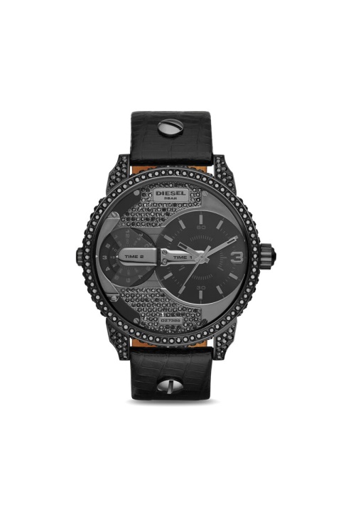 אחריות אבני ריצוף בשחור ג’ט ורצועת עור שחורה מובלטת וחלקה משדרים עומק עם מגע של גישה בעיבוד האיקוני המיידי הזה של קולקציית השעונים של Diesel Daddy.