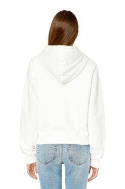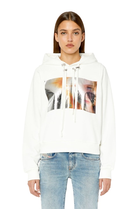 סווטשירט קפוצ’ון לנשים בגזרה רגילה עשויה כותנה ג’רזי, בולט בפירוט שרוך כפול עם מעצורים. גימור עם פאנל נייר כסף מודפס על החזה ולוגו דיזל רקום.