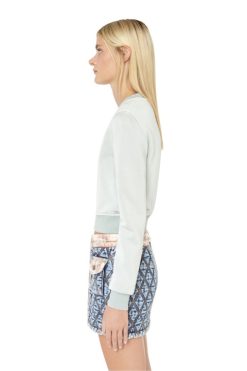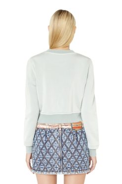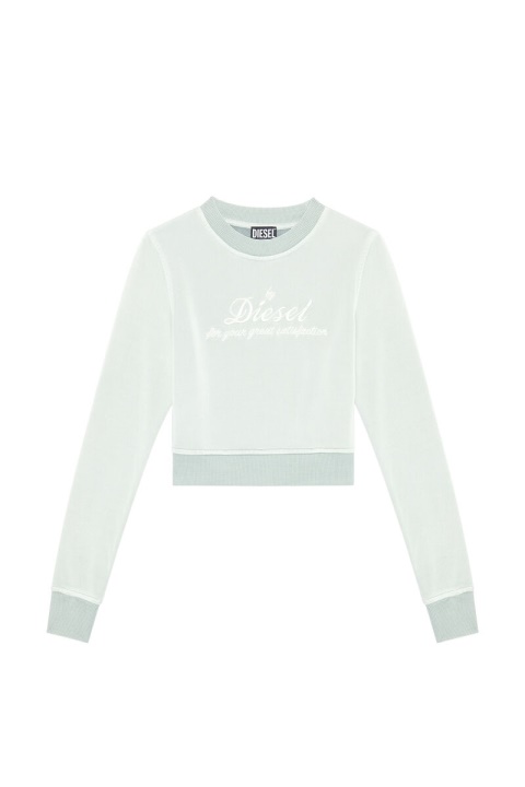 גזרה בגזרה דקה, סווטשירט קצוץ לנשים זה מתהדר במבנה מצופה עם ויסקוזה נוזלית מבחוץ וכותנה מאחור. הבגד צבוע למראה דהוי, רקום בלוגו ארכיוני של דיזל.