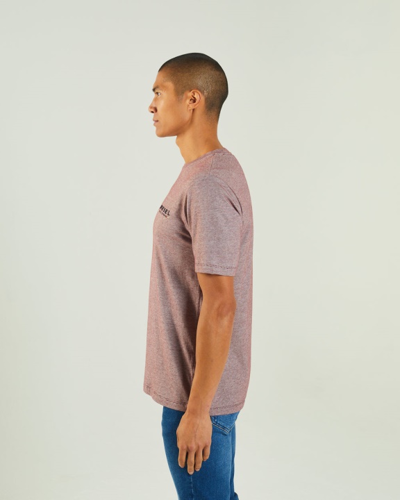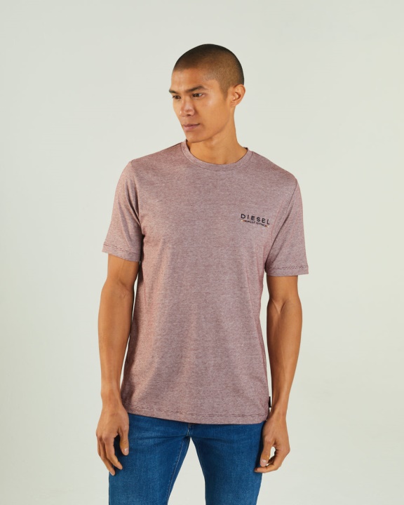 חולצת טריקו עם פסים מכותנה אורגנית לגברים. לוגו פרימיום דיזל רקום על החזה. שלב עם זוג מכנסי הג’ינס המכובסים הכהים שלנו למראה קז’ואל חכם.