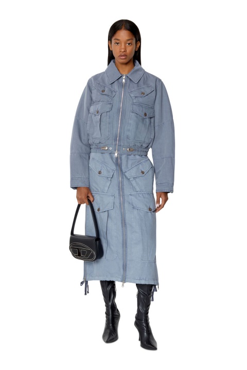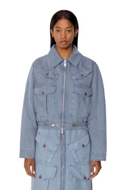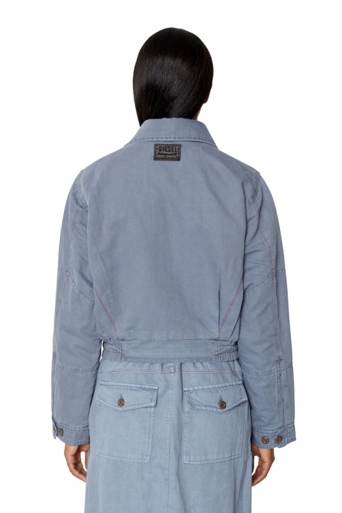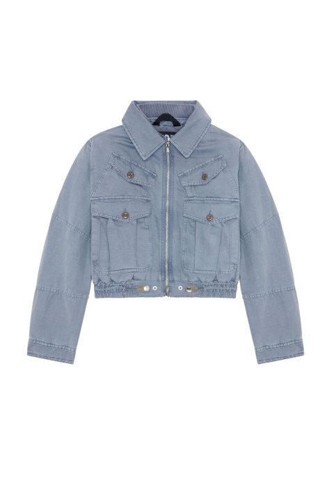 ז’קט נשים באריג בתערובת פשתן. הסגנון המרופד הזה, הגדר על ידי הכיסים התועלתניים, הצבאיים, נפתח כדי לחשוף פאנל תואם עם רוכסן עם צוואר נוסח בומבר. ניתן להתאים את הצללית בהתאמה רגילה בחפתים ובמותניים.