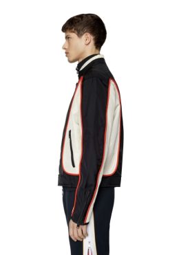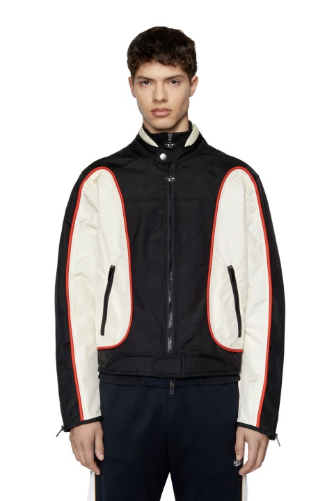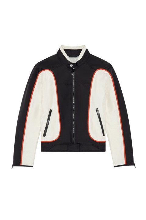 מעיל אופנוע בהתאמה רגילה בניילון חזק ודוחה מים. דגם זה של אופנוען ארכיוני משנות ה-90, כולל חסימה בצבעים עזים ובטנת רשת. החלק האחורי מפורט עם לוגו D אובלי.