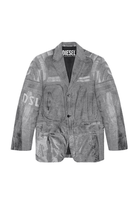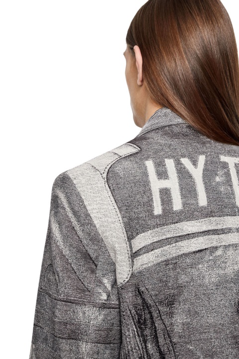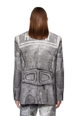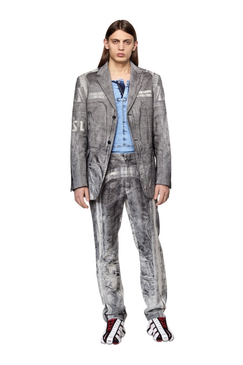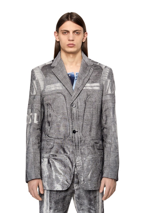 קולקציית תצוגות אופנה אביב-קיץ 2022. בלייזר זה מציג מראה אופנוענים מסוג Trompe L’oeil המבוסס על אריגת אקארד מורכבת. עשוי מתערובת צמר בתולי מועשר במשי, בעל פרופיל חד חזה רגיל ובטנה מלאה.