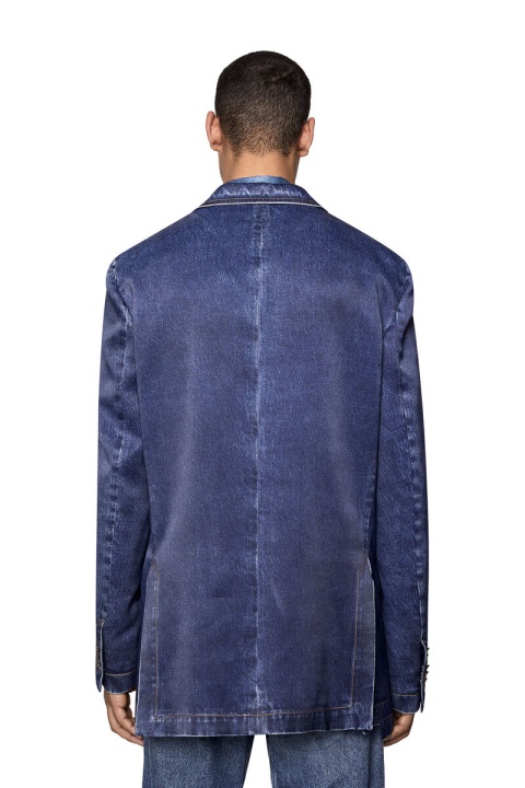 קולקציית תצוגות אופנה אביב-קיץ 2022. בלייזר נוזלי זה הודפס במיוחד בלייזר עם תמונה של פריט ג’ינס נטי ליצירת אפקט טרמפ לאיל. מותאם להתאמה רגילה מבית ויסקוזה מבריק, הוא כולל דשים חורצים, כפתורי שוק ופתח אוורור כפול.