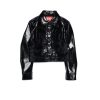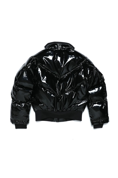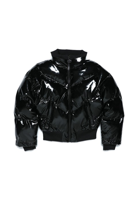 מעיל הנשיפה הזה לילדות עשוי מויניל שחור מבריק, עם תפירת מקסי שברון וריפוד לבידוד. הצללית כוללת קו צוואר גבוה, עיטורי צלעות וסגירת רוכסן קדמית עם משיכה של לוגו.