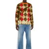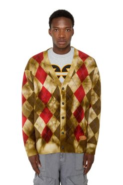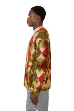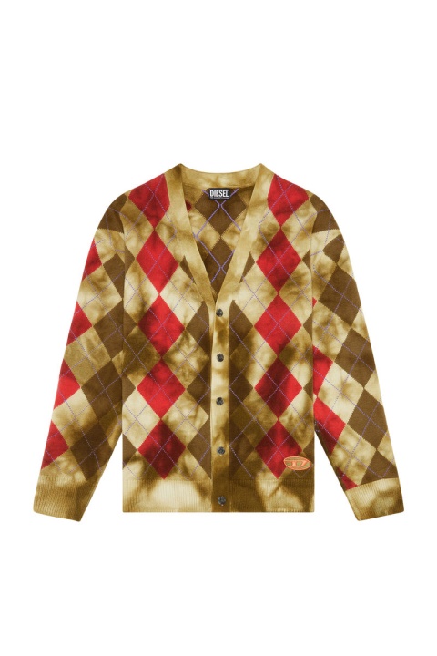 קרדיגן גברים זה מציג דוגמת ארגייל סרוגה באינטרסיה מחוזקת ב-tie-dye. טוויה מתערובת צמר בגזרה רופפת, הוא גימור עם כפתורי קרן מלאכותית ורקמה ‘אובלי ד’.