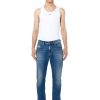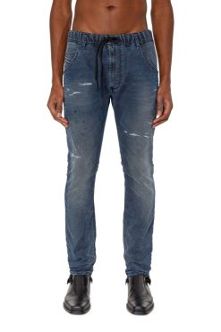סגנון מחודד מעוצב ב-JoggJeans לנוחות מירבית. הרגל המעוצבת מצטמצמת לקרסול, וחגורת המותן כולל שרוך. זוג זה כולל שטיפה כחולה כהה עם שפם גלוי, כתמי צבע ופרטים קרועים ומתוקנים.