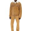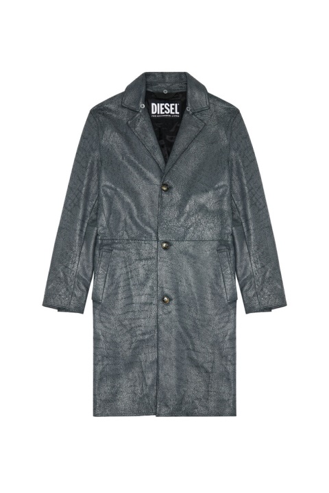 מעיל גברים בכושר רגיל מחויט מעור שחור גמיש עם ציפוי סדוק. הצללית החד-חזה מוגדרת על ידי הצווארון הנשלף המטושטש וגימורים סביב הברכיים.