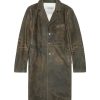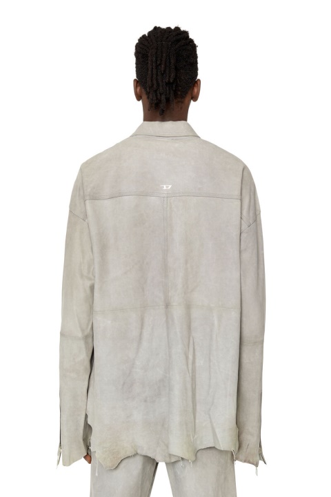 קולקציית סתיו/חורף 2022 Runway Show. עם הגוון האפור הדהוי מעט וקצוות הגולמיים הטבעיים, חולצת העור הגמישה הזו נראית כמו חתיכת וינטג’. הצללית הרופפת כוללת צווארון קלאסי, חפתים עם רוכסן וסגירת רוכסן דו-כיונית.