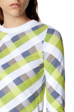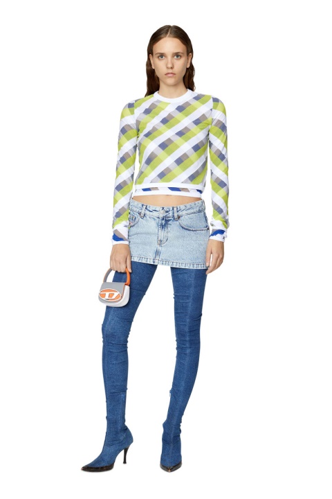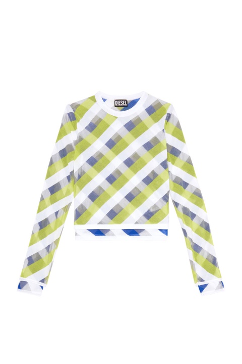 מגשר לנשים זה קל במיוחד ומעט שקוף, עשוי משתי שכבות סרוגות פסים, חופפות אסטרטגית ליצירת מוטיב ארגילי נועז בכחול, לבן וירוק. עיטורי צלעות דקיקים מתארים את הצללית הדקה ללא נפח.