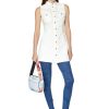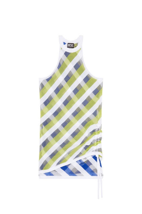 שמלת מיני קלה זו סרוגה בחוטים עדינים במיוחד לגימור שקוף, עשויה משתי שכבות פסים, חופפות אסטרטגית ליצירת מוטיב ארגילי מודרני בכחול, לבן וירוק. יש לו צללית דקיקה עם צווארון וגב רייסר.