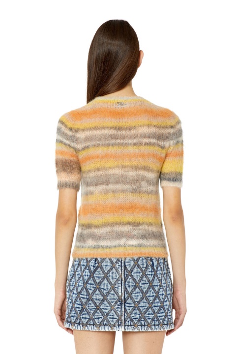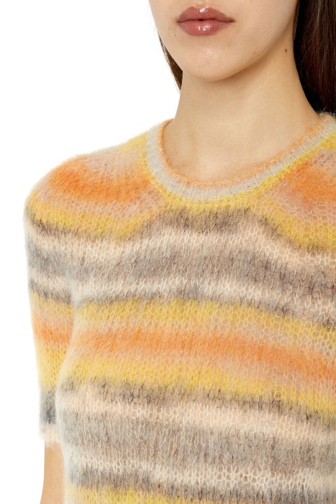מגשר לנשים בכושר רגיל עם שרוולים קצרים. חלק עליון זה, המסתובב צבעים תערובת עשירה באנגורה ואלפקה, סרוג בפסים רכים בשלל ובעל כתפיים מצוירות בריסוס. הגימור המוברש נותן לו רגש ומטושטשת במיוחד.