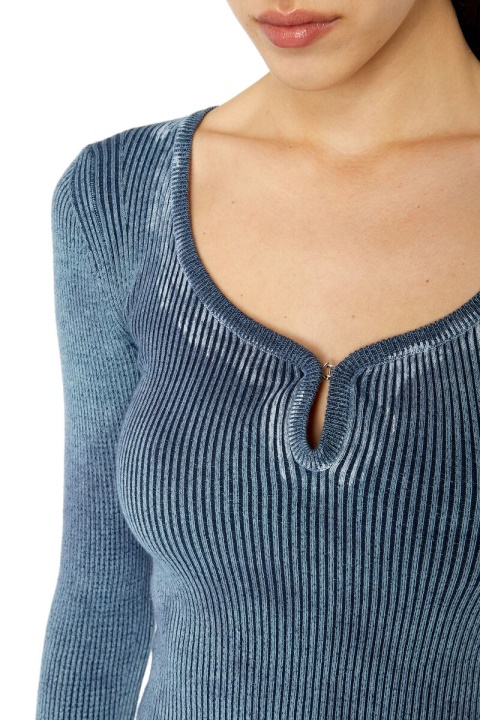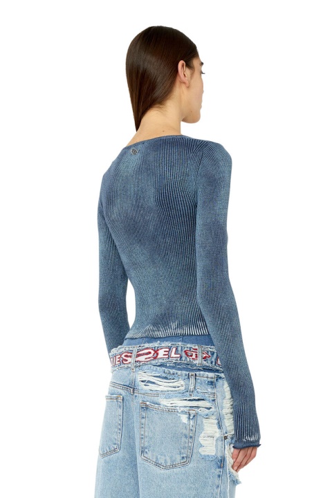 עשוי מסריג מצולע צמוד, חולצת עולים ארוכים לנשים זו כוללת חורי גודל וגזרה להדק וו להעמקת קו הצווארון. הגוון והדהייה דמוי האינדיגו הניואנסים נוצרים באמצעות שילוב של טכניקות מיוחדות של סריגה וצביעה ידנית. הגוון דמוי האינדיגו בעל הניואנסים נוצר באמצעות שילוב של טכניקות מיוחדות של סריגה וצביעה ידנית. דהייה ידנית מדגישה את הצווארון, האזיקים והשולי.