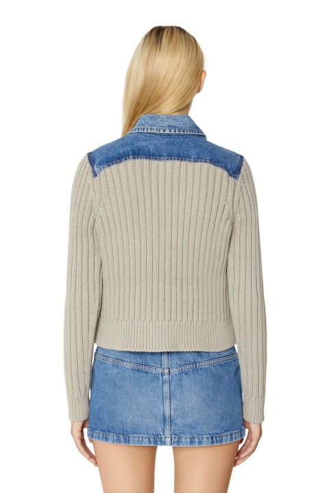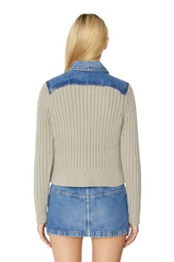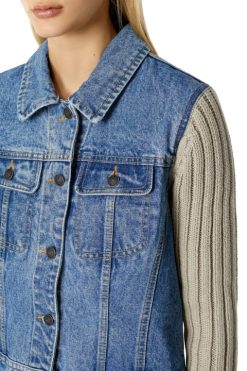 מעיל משאית לנשים. הצללית הקלאסית מעובדת מחדש בפאנלים של ג’ינס כחול שטוף וסריג מצולע בז’, המציע התאמה דקה גמישה.