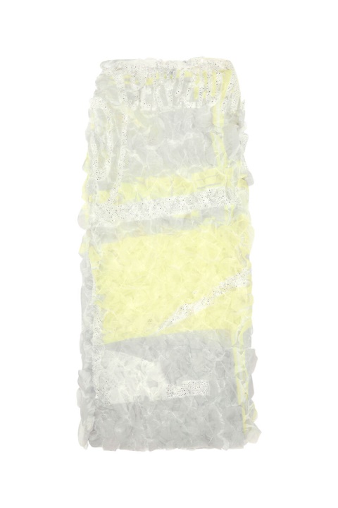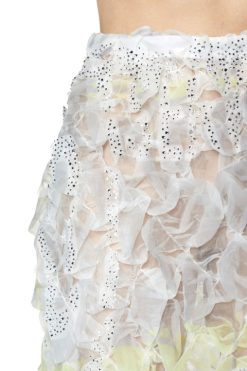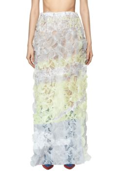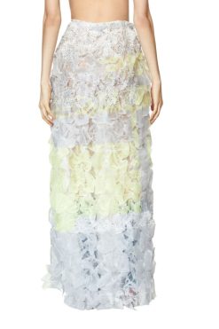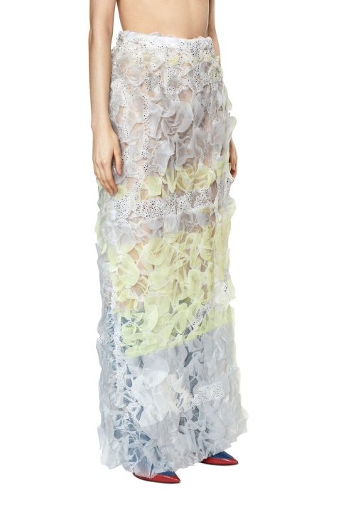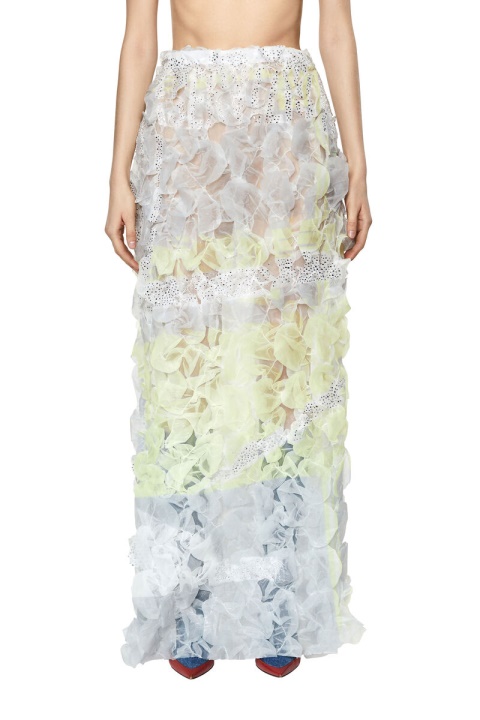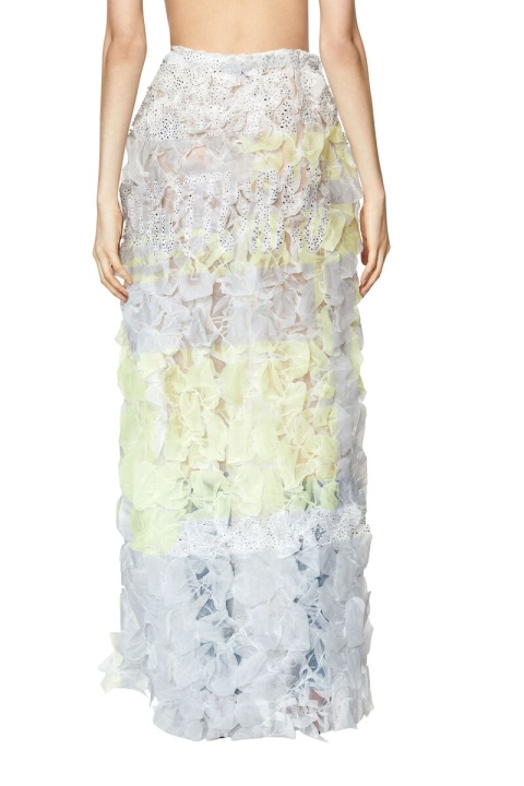 קולקציית תצוגות אופנה SS22. חצאית ארוכה נפוחה חתוכה מפאנלים מעוטרים באומנות של אורגנזה שקופה, מועשרת בגרפיקה מודפסת צבעונית וקריסטלים זעירים. כל חלק נסיים בעבודת יד כדי לשפר את הברק והנפח.