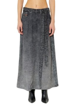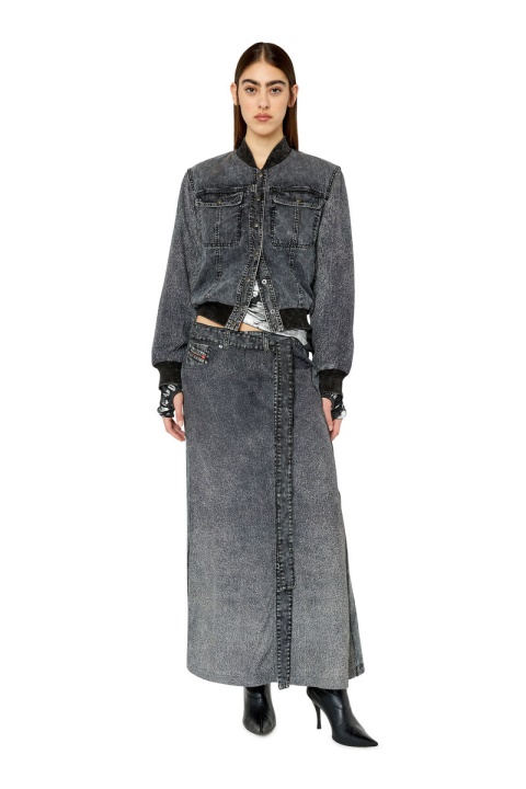 חצאית ארוכה בגזרה רגילה מטוויל מסובבת עם סיבי ויסקוזה ECOVERO, מודפסת דיגיטלית לאפקט ג’ינס טרמפ ל’איל בכביסה אפורה. מעוצב עם חגורת ג’ינס וקשירת צד, הוא כולל את פרט דגל הכיס החמישי האייקוני של דיזל.