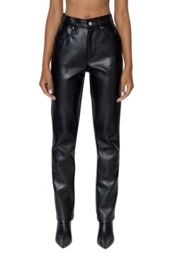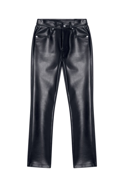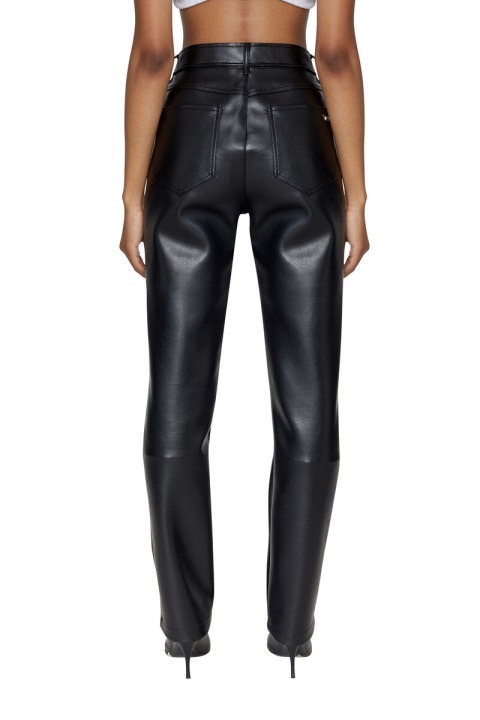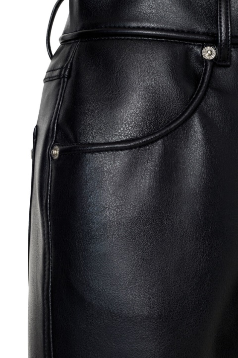 מכנסי חמישה כיסים לנשים אלה בנויים מפוליאוריתן מלוכד. חתוכים בהתאמה רגילה עם מותניים גבוהים, שוליים עם צנרת במותניים ובכיסים. מעוטר בלוח ד מתכת בגב.