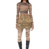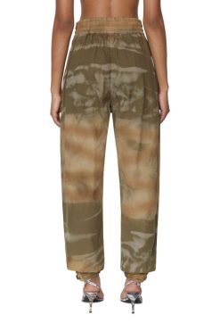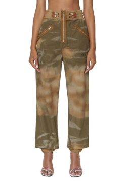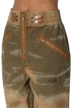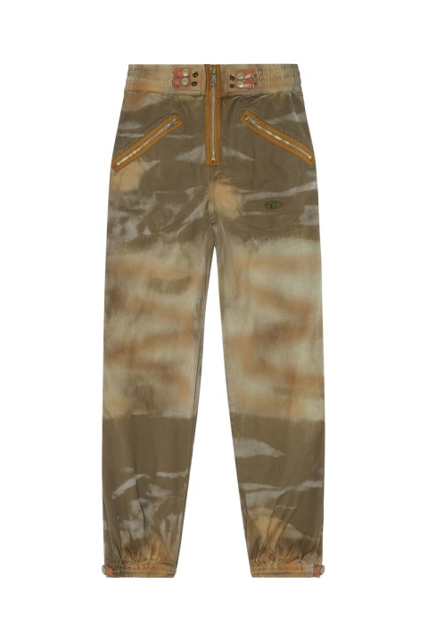 מכנסיים לנשים אלה, חתוכים להתאמה רגילה, מטופלים בעבודת יד לאפקט קאמו: סאטן כותנה צבוע בפיסות ובלייזר מורכב לפני קשירה וריסוס כדי להשיג מראה אחיד. ניתן לכוונן את המותן והחפתים האלסטיים באמצעות שרוכים.