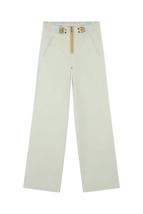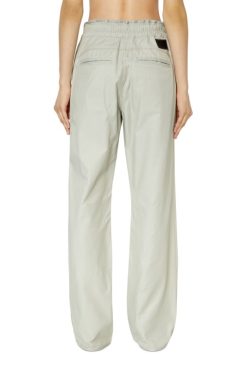מכנסיים רפויים לנשים אלה חתוכים מטוויל כותנה-ניילון מט, ננעל עם רוכסן גלוי. ניתן לוסטית את המותניים האלות באמצעות שני שרוכים עם כפתורי לחיצה. סיים עם תיקון דיזל אחורי.