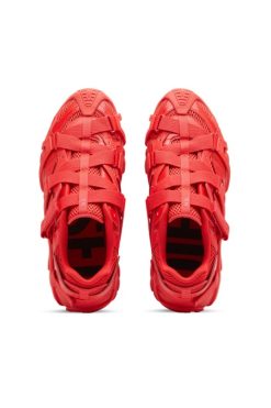 נעלי ספורט לגברים FW Runway Show Collection ’22 הבנויות מרשת נושמת מצופה עור. נעל זו כוללת רתמה דמוית כלוב העשויה עם רצועות מוצלבות וגומי המתחברות לסוליה התעשייתית. הסוליה עוטפת את הבוהן ומסתיימת ב’שיניים’ גומי בהשראת ארכיון למראה ייחודי. הגרסה האדומה של פריט זה היא מהדורה מוגבלת.