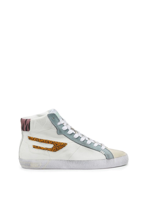 נעלי ספורט גבוהות מעור וזמש מעודכנת עם הדפסי נמר וזברה על לוגו D ועל לשונית העקב. הסוליה העליונה והמגופרת מטופלות בגימור אפקט מלוכלך למראה כחול. מפורט עם שלושה תפרים על עמוד העין.