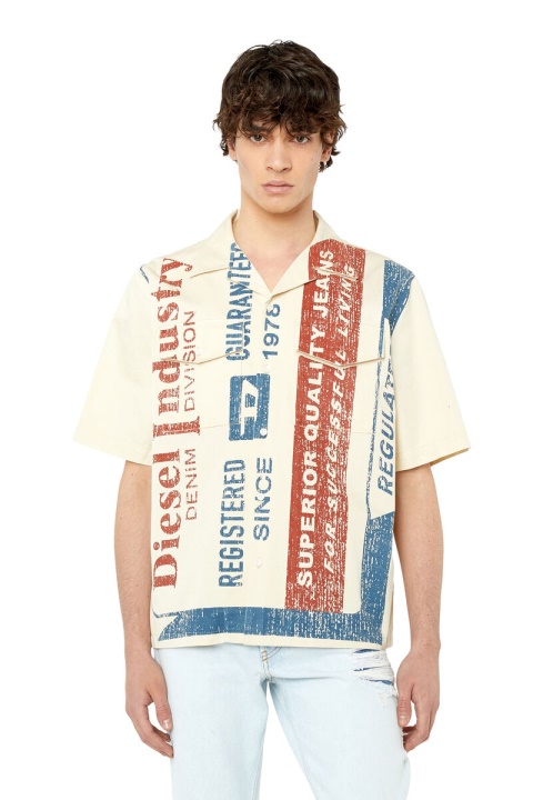חולצת באולינג רפויה לגברים הבנויה מאריג כותנה אורגנית כפולה. הוא מודפס בחזית עם גרסת מקסי של תווית הג’ינס האייקונית של דיזל תעשייתי.
