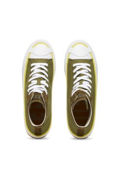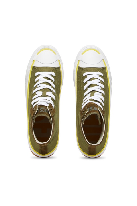 נעלי ספורט קנבס שטופות עליון, עם התאמה יציבה דמוית מגף וסוליה מגופרת בשכבות. סגנון זה מעודכן עם כובע אצבע עבה מכוסה גומי ומשטח מסטיק משופע, סגנון זה כולל את הלוגו ‘דיזל דנים’ בצד.