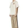 חולצה גברים עם שרוולים קצרים בצבע TENCEL Lyocell טוויל נוזלי. סגנון רגיל, הוא מודפס עם דפוס פסים שנראה נשטף באופן לא סדיר. טלאי ד סגלגל על החזה.