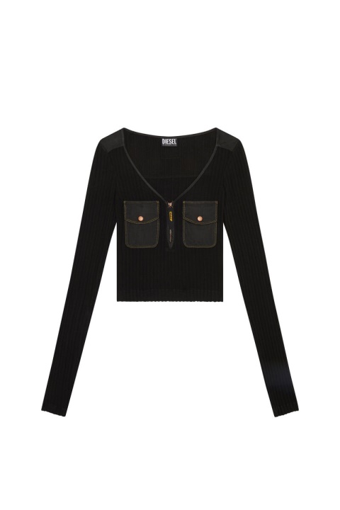 קרופ טופ לנשים מעוצב בצללית דקה עם צוואר סקופ מתכוונן עם רוכסן. רך זל, לסגנון צבוע הבגד הזה יש ידית סרוגה מצלעת ונו ועיטורי סאטן אלגנטיים בכיסים ובחלק האחורי.