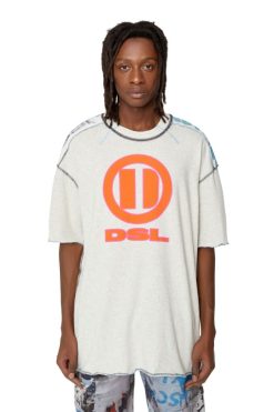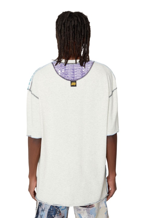 חלק מקולקציית סתיו 22 Runway Show, חולצת טריקו זו גזורה מכותנה מלנג’ אפורה, המוגדרת על ידי תפירת אוברלוק בשני צבעים מנוגדים והדפסת DSL דהוי. מריחות קלות של פופלין על הכתפיים משלימות סגנון רגוע זה.