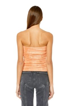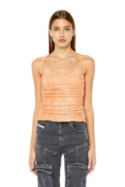 חולצת כותנה לנשים זו חתוכה מג’רזי צלעות מתיחה ומצופה בנייר כסף מבריק למראה וינטג’ עדין. מעוצב עם רצועות ספגטי ואיסוף צד, הוא כולל לוח מתכת אליפסה ‘D’ על החזה.