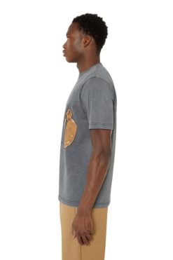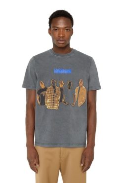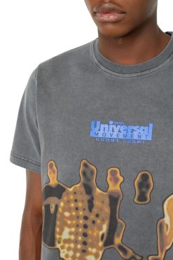 גזרת טי לגברים בגזרה רגילה מג’רזי כותנה שחורה, מטופלת ומרוססת למראה דהוי. החזה מודפס עם לוגו ‘Disel Universal Movement’ מגומי וגרפיקה של סורק תרמו דיגיטלי. כיתוב בהדפסה נפוח מעט את הגב.