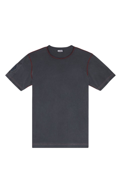 חולצת טריקו לגברים בגזרה רגילה עשויה מג’רזי כותנה איכותית, צבועה למראה וינטג’. מעוצב עם תפרי אוברלוק מישוש, הוא כולל טלאי ג’ינס מודפס בלייזר על השרוול, נחשף דרך חלון עגול.