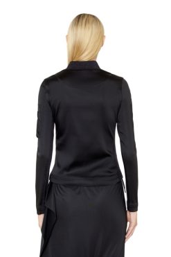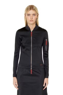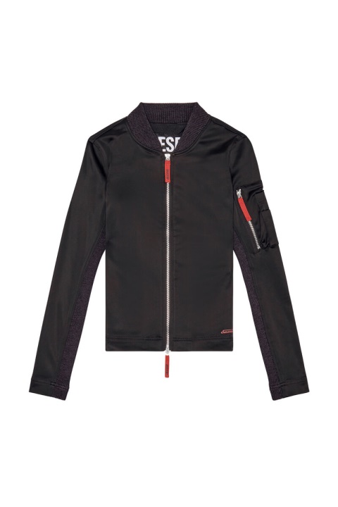 ז’קט בומבר לנשים בנוי מסאטן מבריק סופר-מתיחה. צלעות טונאליותדים ובשרוולים פנימיים מדגישים את הפרופיל הדק שלו. בציפוי כיס עם רוכסן בשרוול השמאלי.