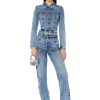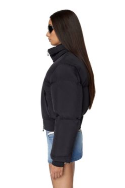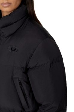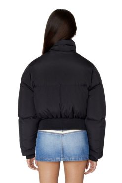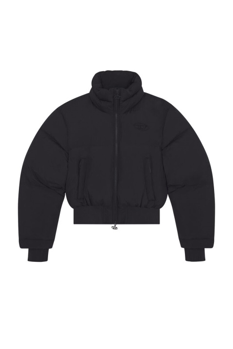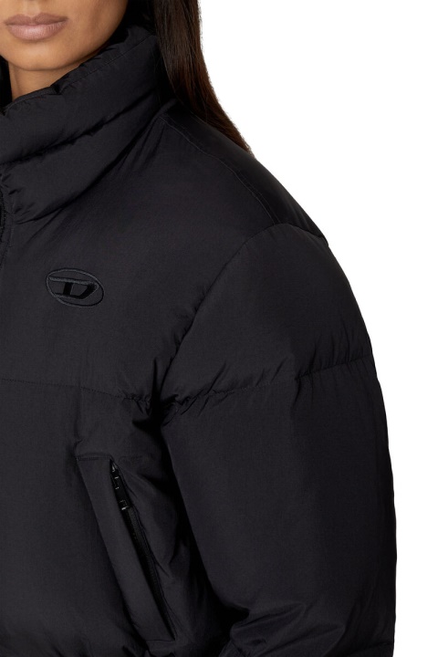 לז’קט חורף לנשים זה יש צללית נפוחה עם צוואר משפך וגזרות מצולעות. הוא נחתך מניילון מקומט דוחה מים, מרופד ועמוס בפוך בידוד. לוגו רקום דיסקרטי מעט את החזה.