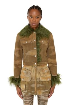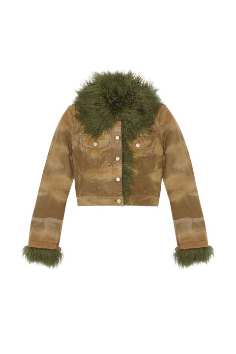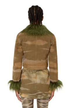 ז’קט זה לנשים דהא בלייזר, נצבע ורוסס ביד ליצירת דוגמת הסוואה בגווני חום וירוק. עשוי מכותנה עם ריפוד מבודד, יש לו התאמה רגילה ועיטורי שאגי נועזים.