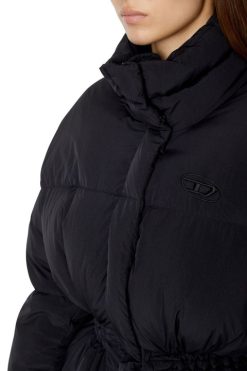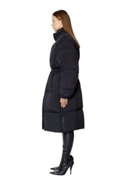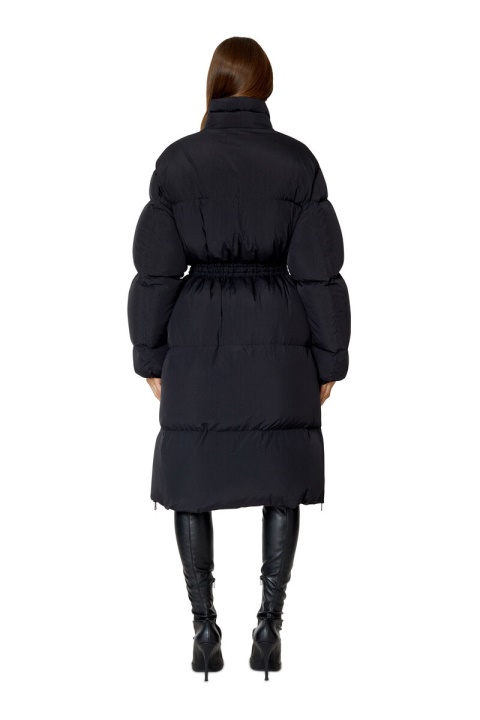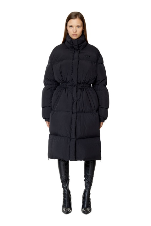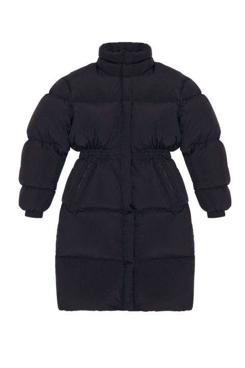 מעיל חורף במילוי פוך, פחזנית לנשים זו חתוכה מניילון מט מרופד רך, מקומט ודוחה מים. לצללית הנפחית עם צוואר המשפך יש מותניים מתכוננים וצידי רוכסן. גימור עם רקמת לוגו גווני בחזה.