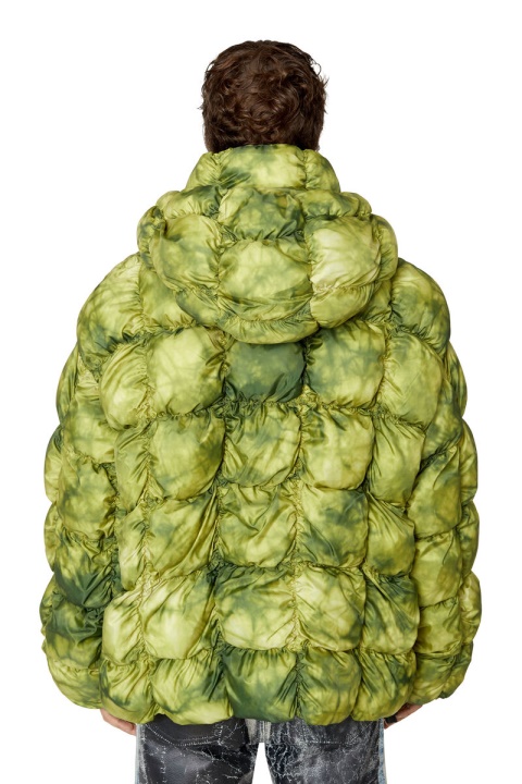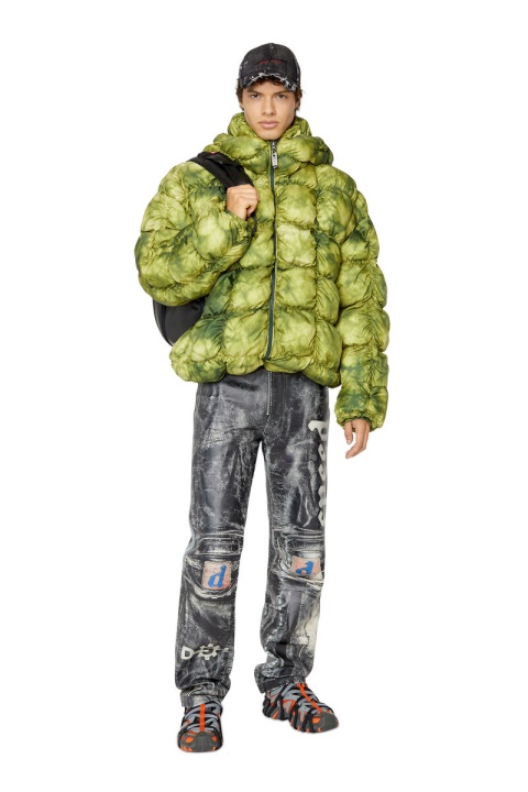 מעיל חורף לגברים בריפסטופ ממוחזר מרופד. מודפס יתר על המידה כדי לדמות עבודת צביעה גרועה, הבד נאסף בטכניקת חלוקים, וכתוצאה מכך דפוס נפוח דמוי קופסה. לצללית קו צוואר גבוה עם קפוצ’ון והתאמה רגילה.